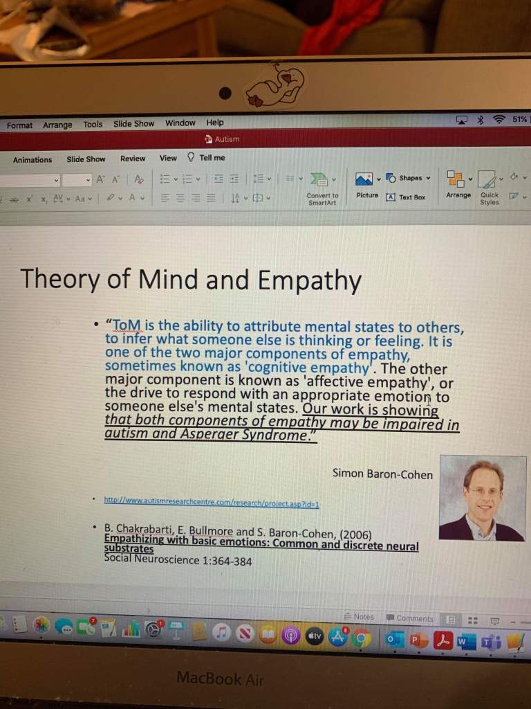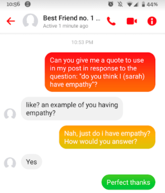 • “both components of empathy may be impaired in Autism and Asperger Syndrome” – Alrighty, this is a misconception that keeps coming up. Certainly not all of us, but many of us have a normal amount or possibly more empathy than the average neurotypical person, we just don’t necessarily express it in the expected way. Varying levels of empathy is a human trait, not just an autistic one. I have talked about this before in a previous post (please click here to read it), but to really hammer this home, I asked my best friend -who I live with and who knows me better than almost anyone else- “Do you think I have empathy”. The response was “Yes”. (See below for screenshot confirmation.) The author of this comment was Simon Baron Cohen who is one of the most well-known, influential autism researchers of the time. He is quite controversial and really deserves a whole post, so I won’t comment too much on this for the time being.
