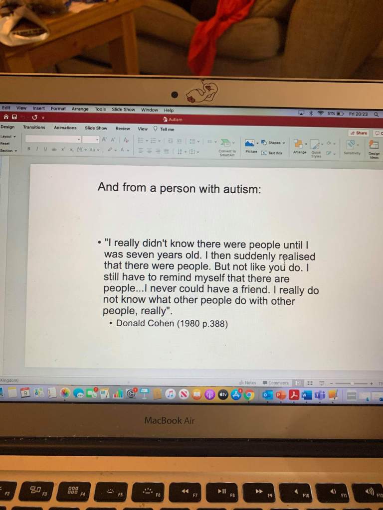 • “Seem to not have the ability to “attend” to others to begin the development of social and communicative skills” – So they include the quoted word “attend” in this extract, and neglect to give any source for where this comes from. If I have learnt anything about respectable academic writing, it is that referencing is key. If we ignore this oversight, the whole sentence is still not factually correct. For a start it is very vague, but my main issue with it is that it is simply not true. Autism varies in its impact on people, but I and the vast majority of autistic people I know are perfectly capable of socializing with others. It is often more difficult, sure. However, I have a group of friends, all of whom are autistic, and we have lovely social interactions with each other. We went for a coffee together not too long ago and ended up having to leave because we’d been there so long chatting that they were closing. We have all talked about how we learnt the social skills we have today and while we all had to put independent effort into learning them, I love spending time with them and find them much less tiring to communicate with than the majority of neurotypical people.