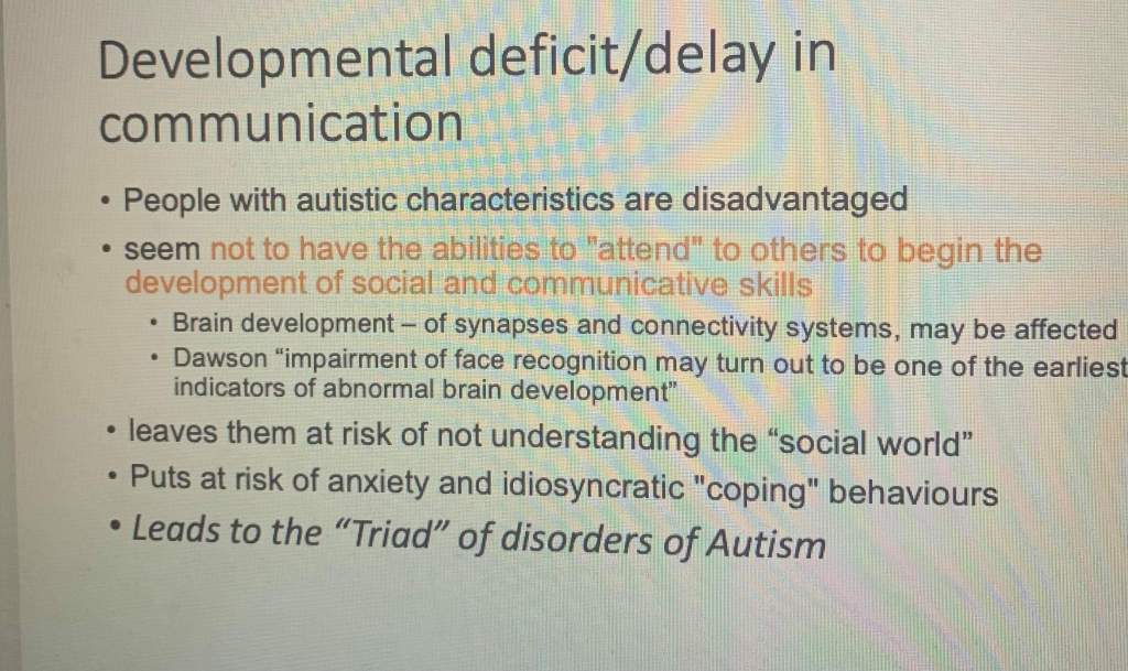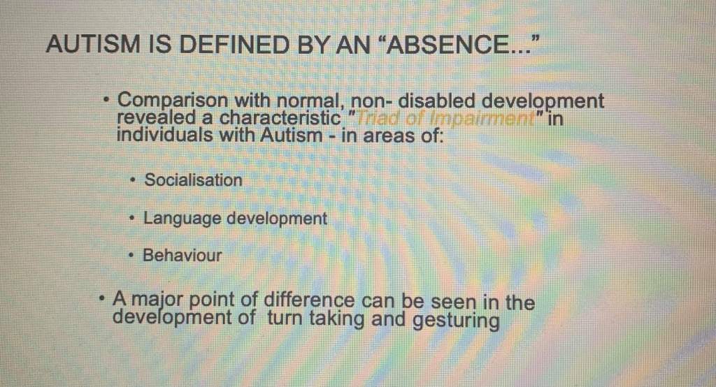 • “Autism is defined by an absence” – Right off the bat, these slides talk about how they view autistic people as being less than what they consider a complete human – they have absences in their personality. Starting this topic on the assumption that autism makes a person in some way less complete is dangerous: it taints everything that follows with the idea that they are deficient or devoid of part of what makes us all people.